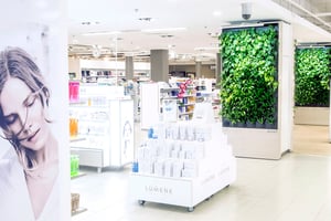 Naava-viherseinät upotettiin kosmetiikkaosaston valkoisiin tukipilareihin. Lopputuloksena syntyi metsämäisiä käytäviä.