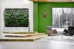 The language immersion school was designed according to biophilic design principles, incorporating elements of refuge and spaciousness as well as natural materials and designs to create a human-friendly environment. NAC Arkkitehdit - the designers of the school - also wanted to invest in connecting the modern learning campus with nature through e.g. implementing sunlight and authentic nature elements into the design. The Naava green walls have found their place right at the entrance of the building, seamlessly integrating into the building.